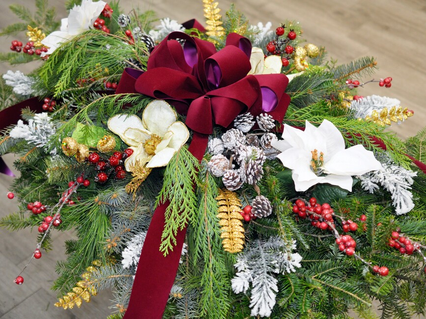 A beautifully handcrafted grave blanket composed of lush, long-lasting evergreen branches—typically balsam, douglas fir, cedar, accented with holiday trim to form a full, low-lying covering that gently drapes across the grave. The greens create a natural, peaceful winter tapestry that symbolizes remembrance, protection, and eternal life. Approx 48"L x 24"W