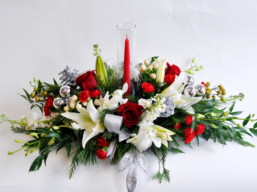 The all time Christmas favorite arrangement. It brings back memories from Christmas past. A glass chimney with red candle is surrounded by fragrant holiday greens and roses, with festive berries, pine cones and silver accents. A delightful addition to any table.