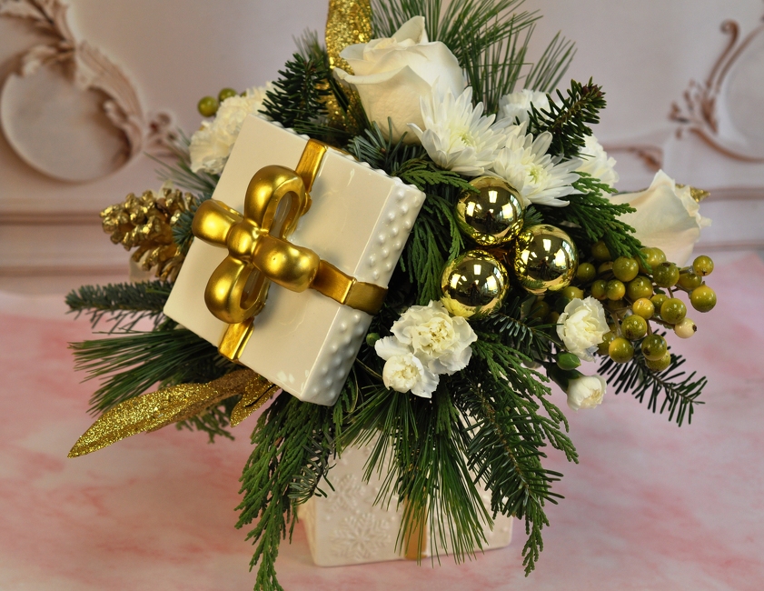 This Christmas arrangement features a white ceramic box adorned with a sculpted gold ceramic bow filled with festive greens, white roses, other white blooms with gold accents.