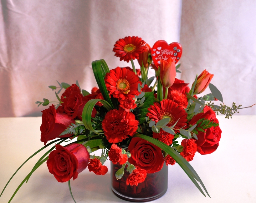 This bold all red floral bouquet includes red roses, gerberas, tulips, carnations and more displayed in a red glass cylinder vase. Unlock the key to their heart!