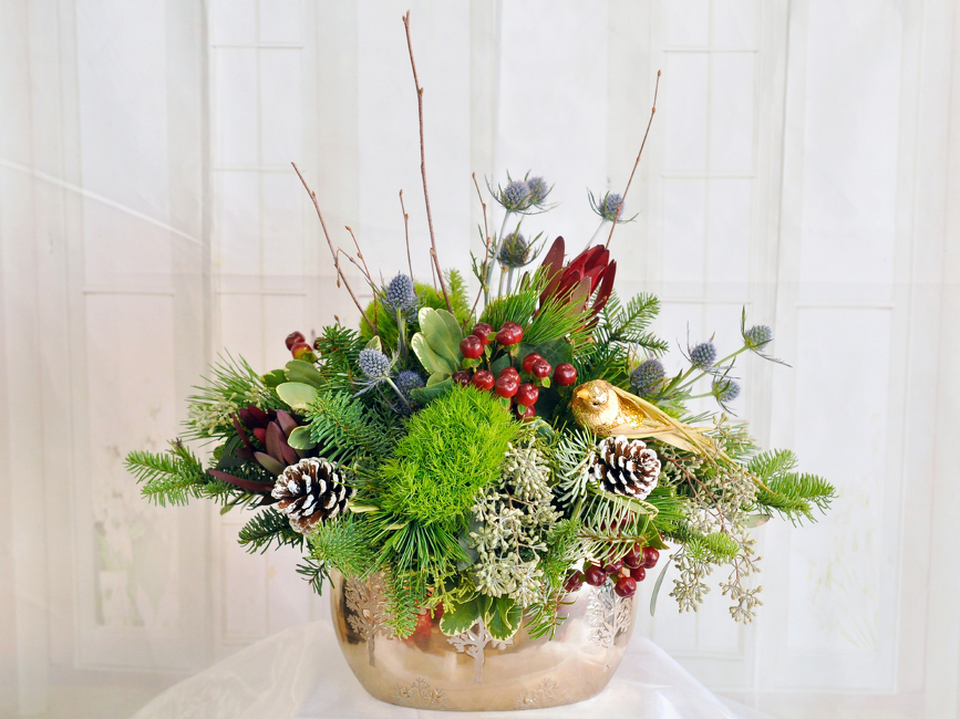 Celebrate the joy of the season with this robust arrangement in a hues of holiday festive greens and trim. Container may vary.