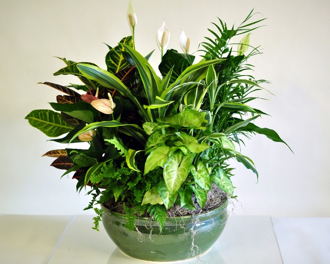 An assortment of green potted houseplants artfully arranged in a large ceramic dish. Container and plants may vary.
