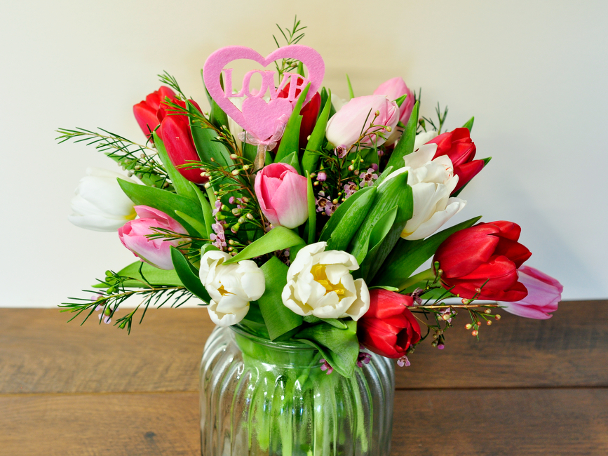 Impress and delight someone with a bouquet bursting in colors of red, pink and white .. everyone's favorite..tulips! Fresh AAA premium locally greenhouse grown tulips in a glass vase. Simply tip toe through the tulips and warm someones heart. Approx 13"H