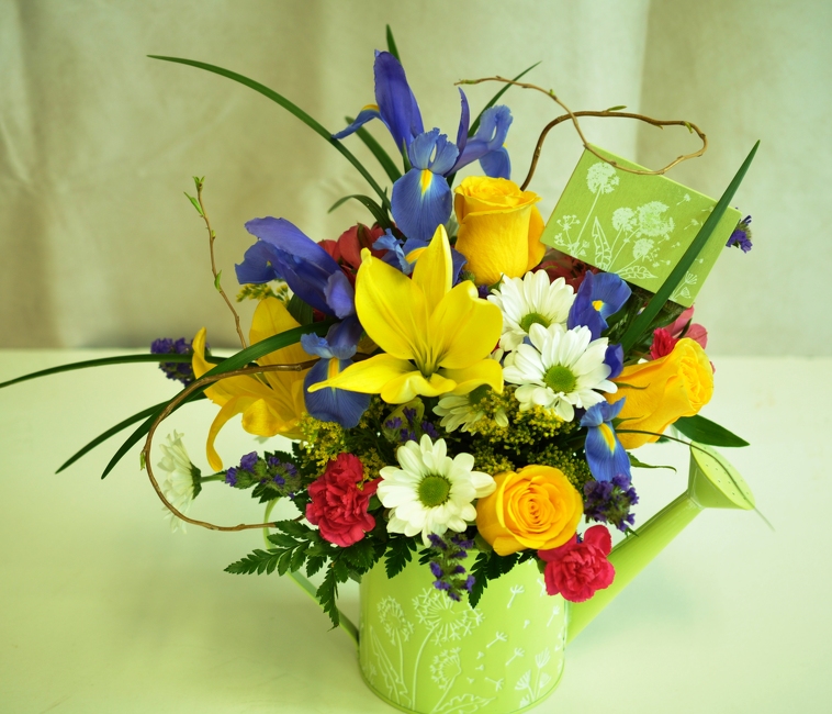 A whimsical tin watering can with matching wooden pick- perfect for brightening the day; filled with iris, lilies, roses daisies and more.