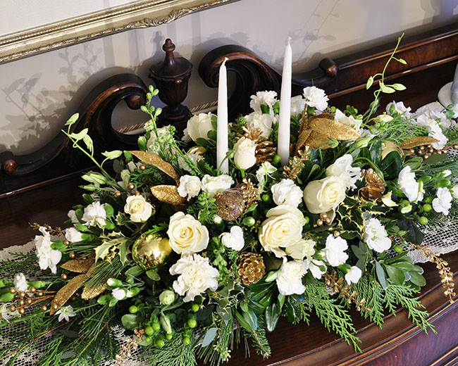 Complete with two white taper candles this magnificent arrangement will bring an elegant glow to the home. A classic centerpiece filled with an assortment of white holiday flowers and greens accented with gold trim. Absolutely stunning. Approx. 32"L